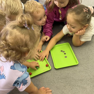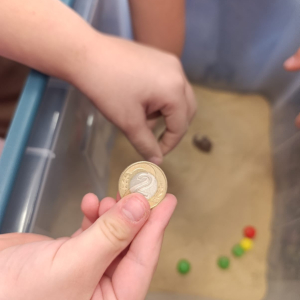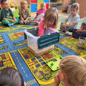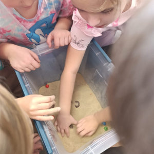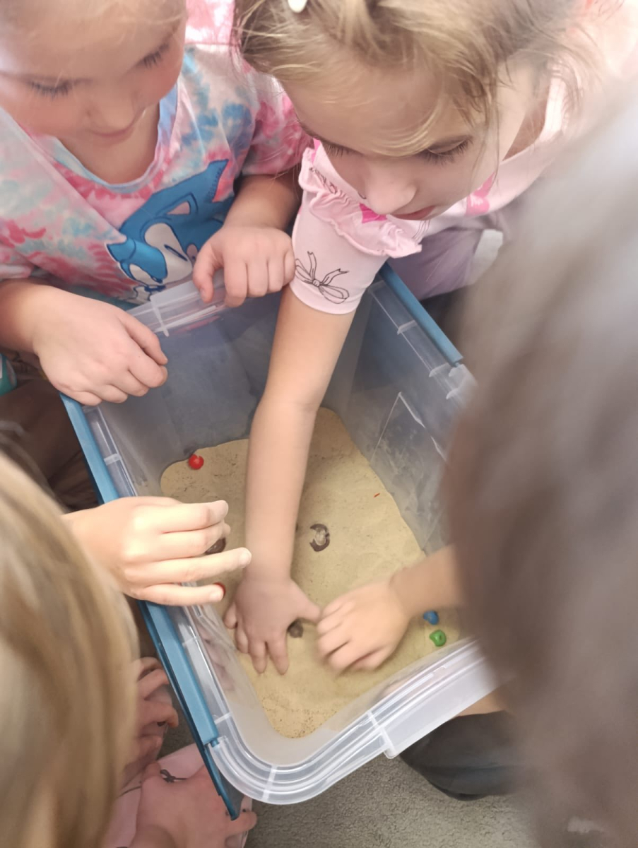 bawiły się w odkrywców, szukając „skarbu” w piasku, ćwiczyły przeliczanie tego, co udało się odnaleźć,