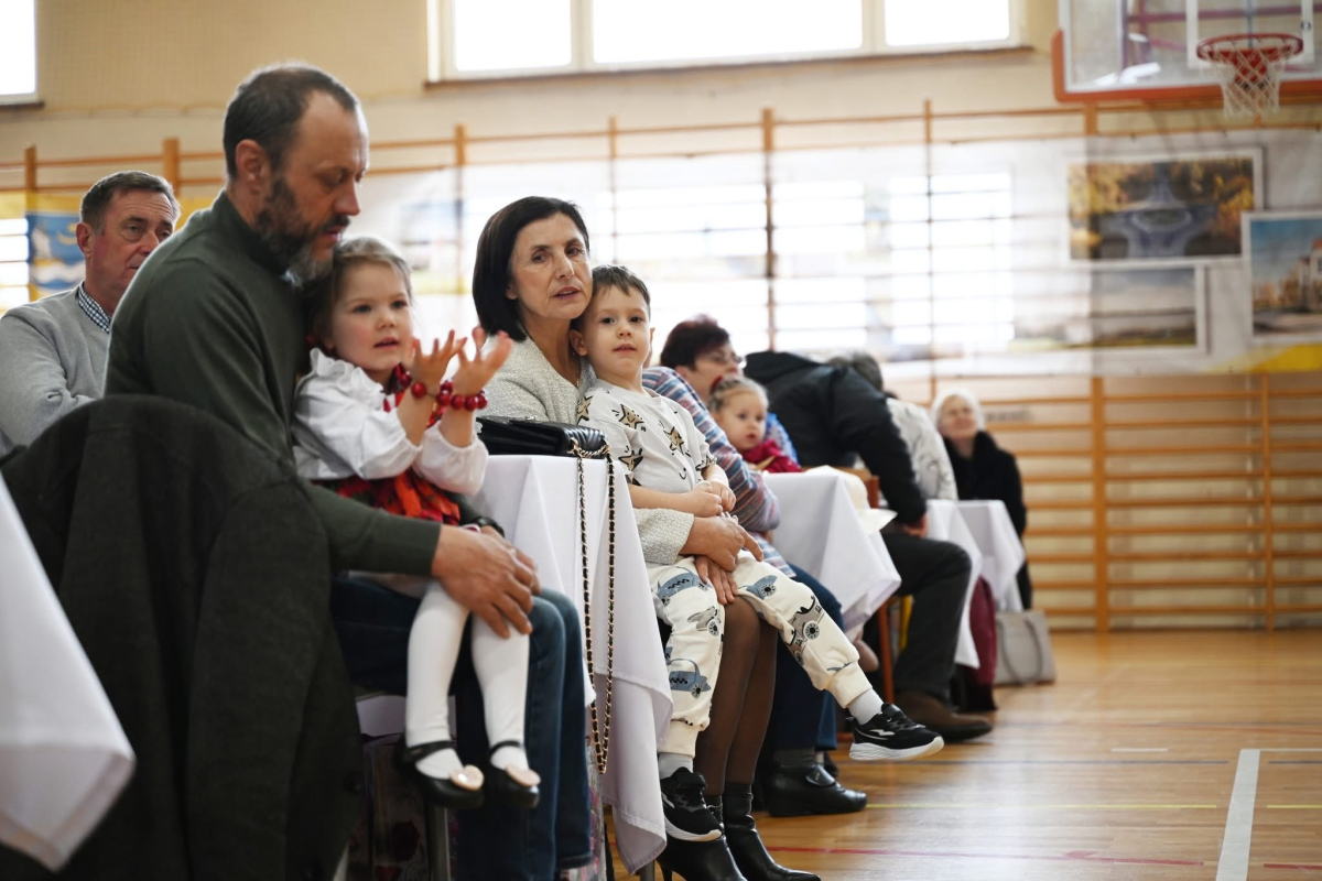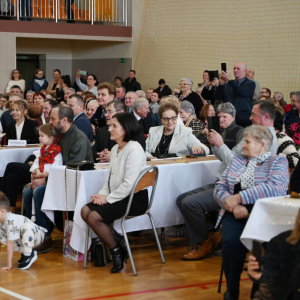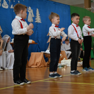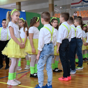 Następnie na scenie zaprezentowali się najmłodsi uczniowie, którzy zachwycili publiczność radosnymi tańcami. Ich występy pełne energii, uśmiechu i dziecięcej spontaniczności wywołały wiele uśmiechów oraz wzruszeń wśród zgromadzonych gości.