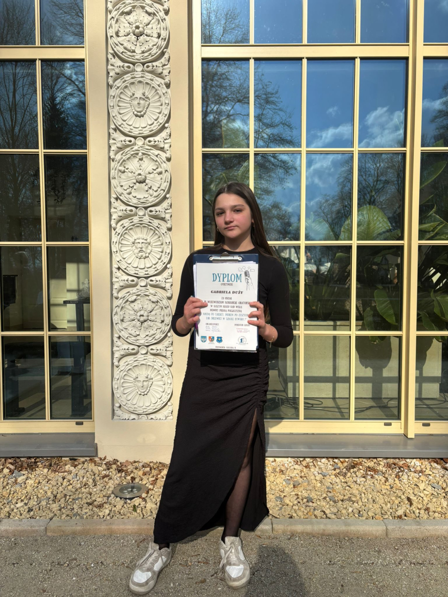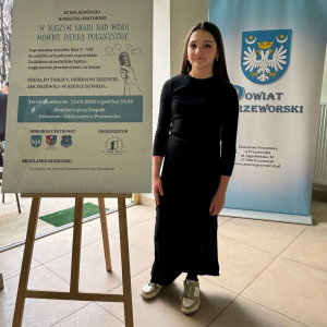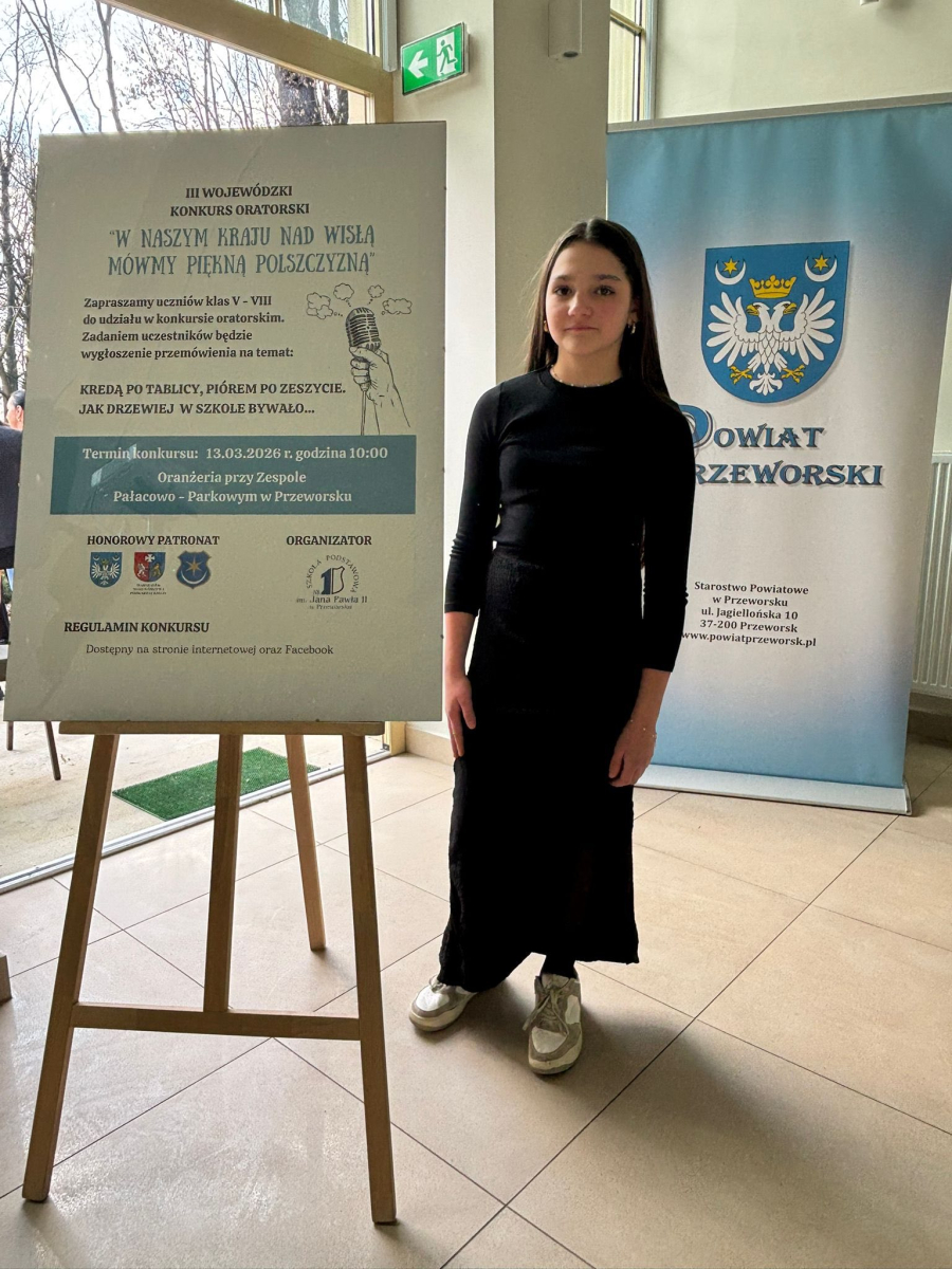 W piątek, 13 marca 2026 r., uczennica klasy VI – Gabriela Duży – reprezentowała naszą szkołę podczas III Wojewódzkiego Konkursu Oratorskiego „W naszym kraju nad Wisłą mówmy piękną polszczyzną”, który odbył się w Przeworsku.