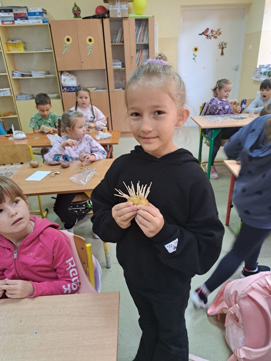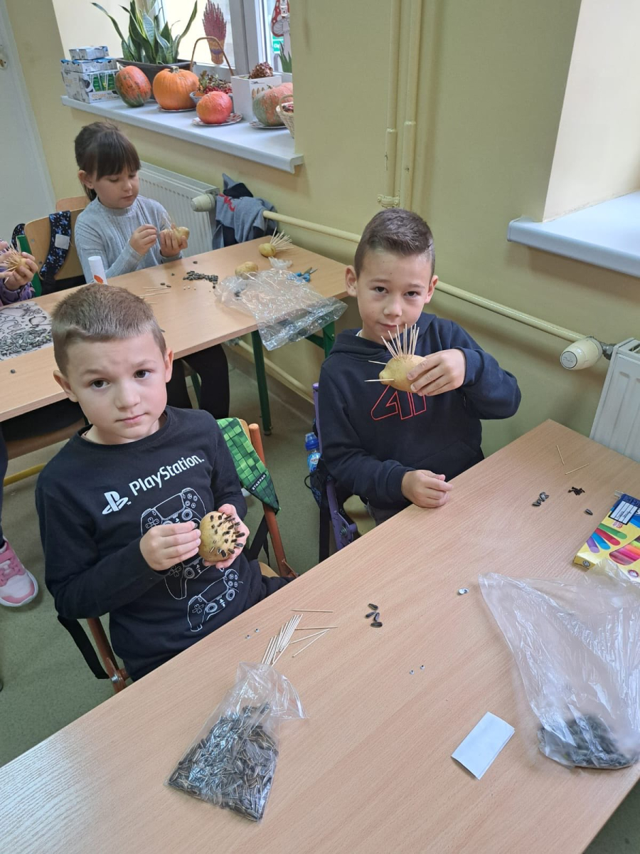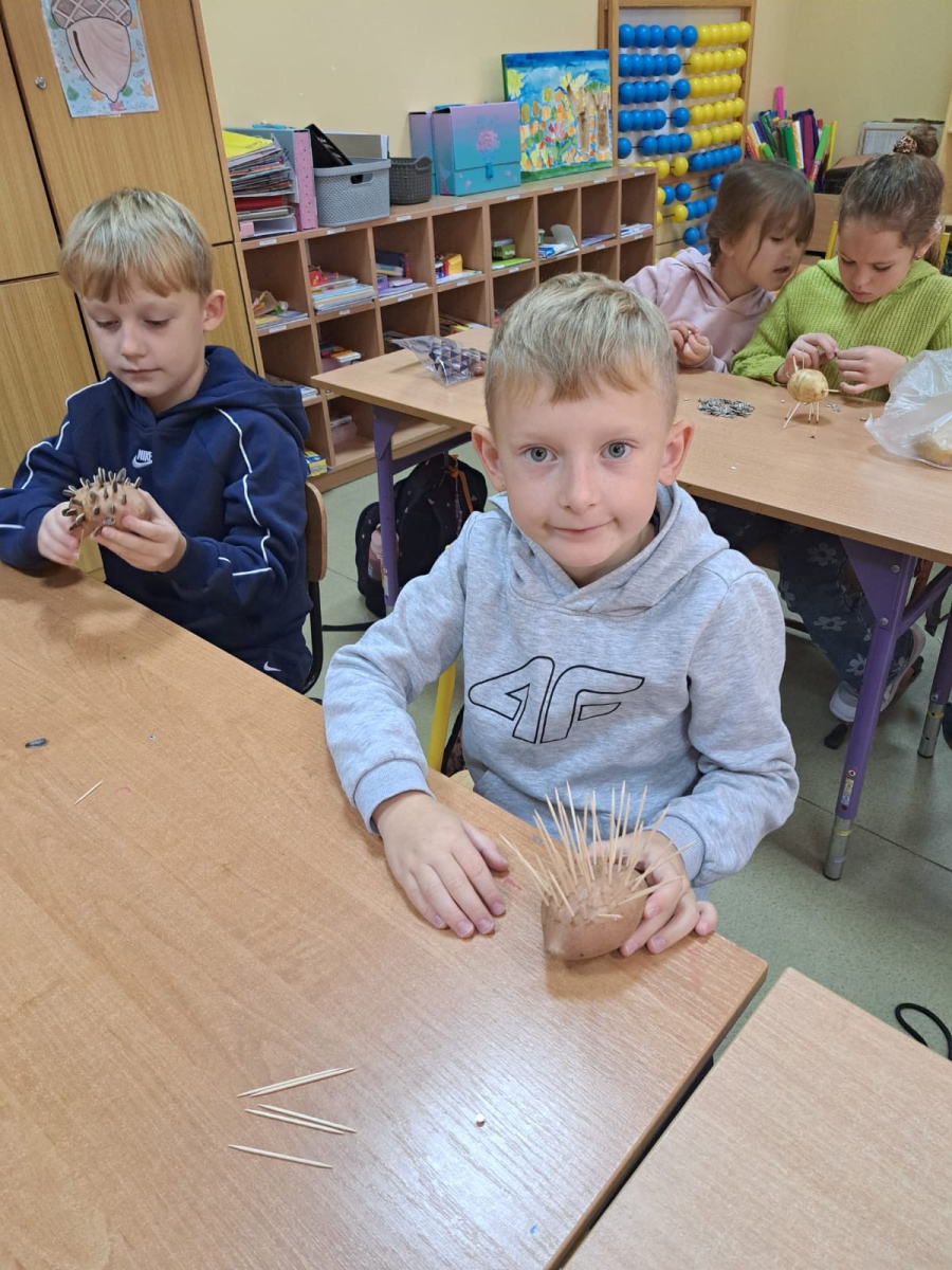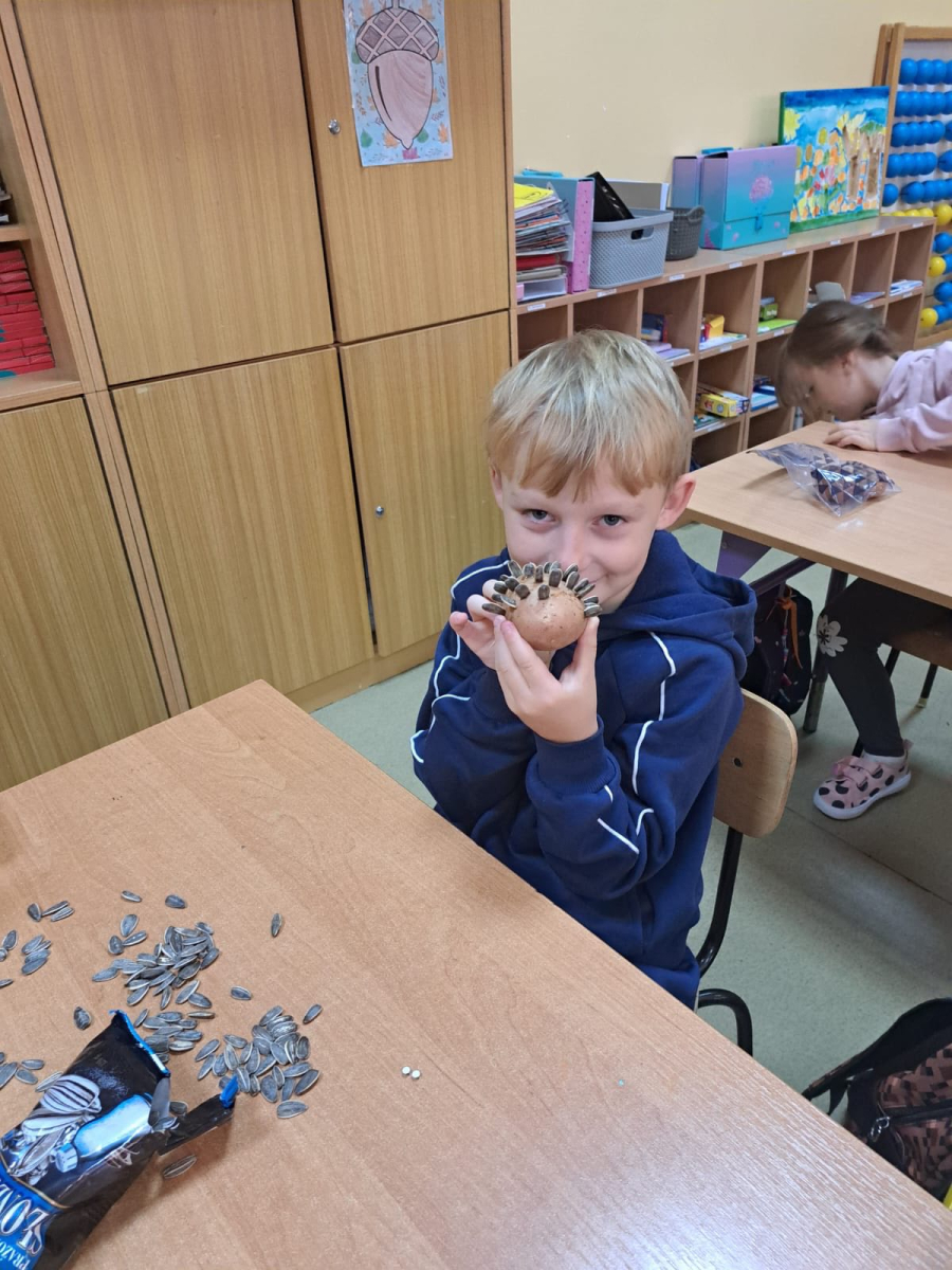 Dziś pierwszaki rozmawiały o tym, jak jesienią możemy dbać o zwierzęta. Zainspirowani tematyką przyrodniczą postanowiliśmy stworzyć własne jeżyki z ziemniaka, szaszłyka i ziaren słonecznika. Powstały przepiękne, pomysłowe prace – jeżyki niosące jabłuszka , które zachwyciły wszystkich! Brawo, pierwszaki!