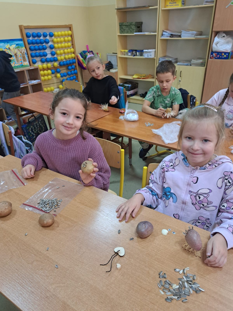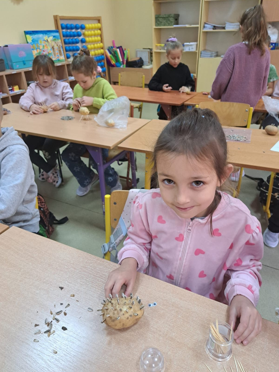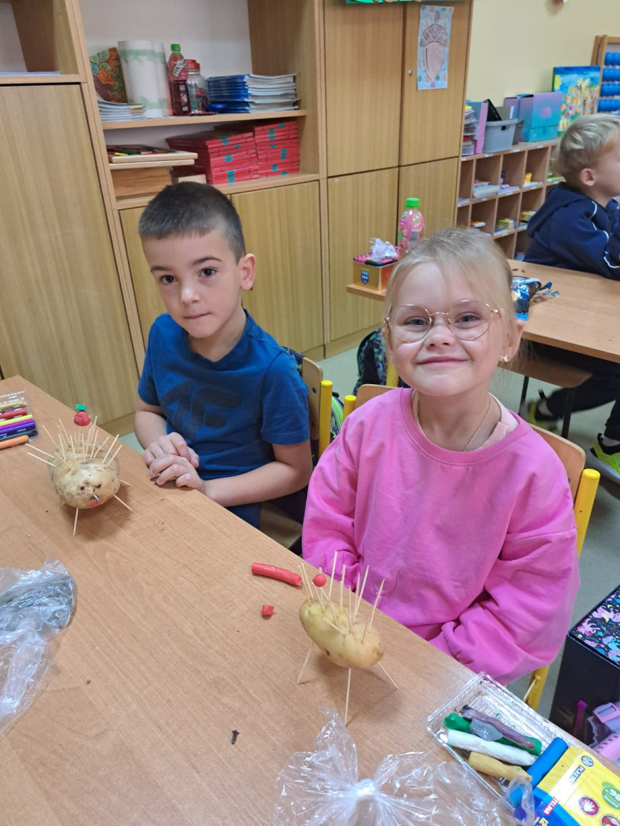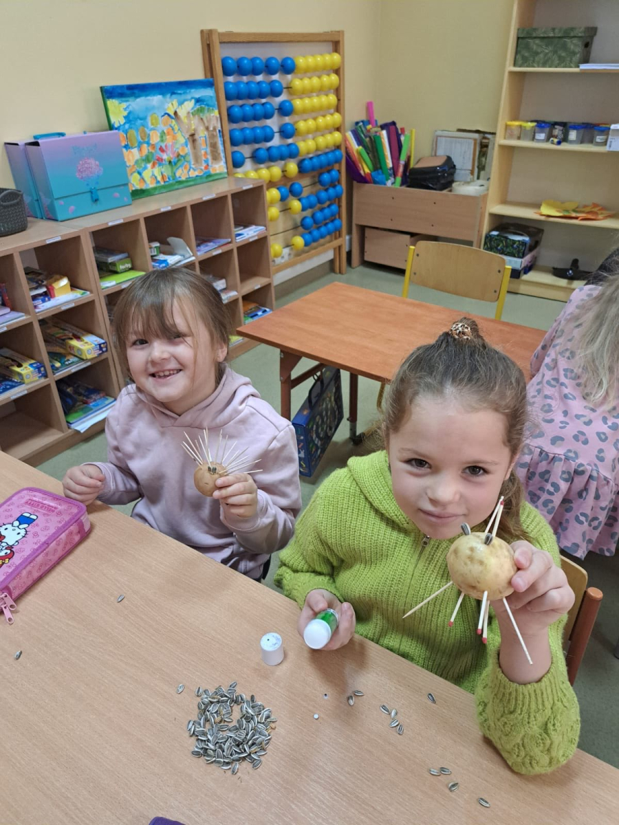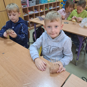 Dziś pierwszaki rozmawiały o tym, jak jesienią możemy dbać o zwierzęta. Zainspirowani tematyką przyrodniczą postanowiliśmy stworzyć własne jeżyki z ziemniaka, szaszłyka i ziaren słonecznika. Powstały przepiękne, pomysłowe prace – jeżyki niosące jabłuszka , które zachwyciły wszystkich! Brawo, pierwszaki!