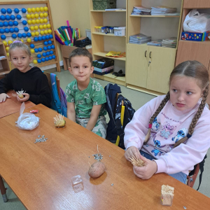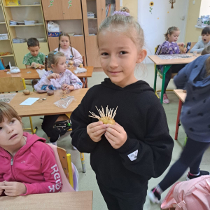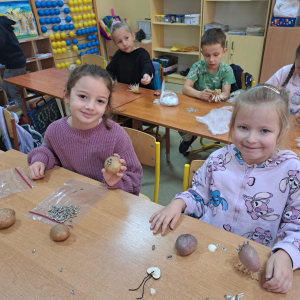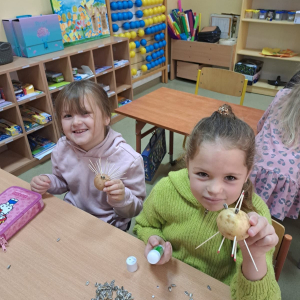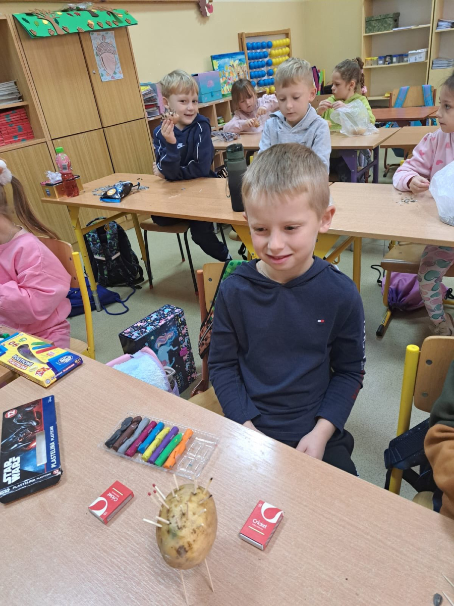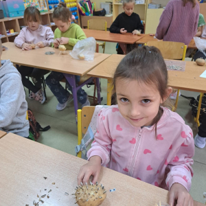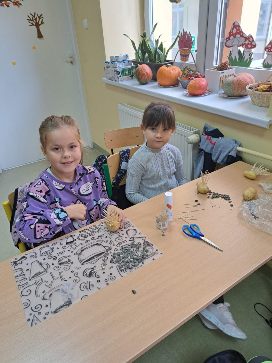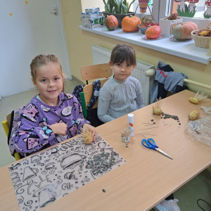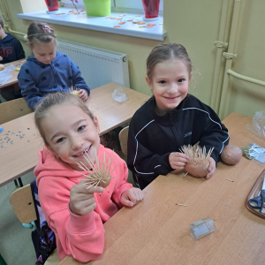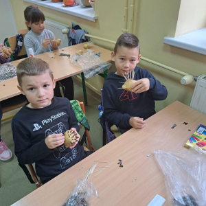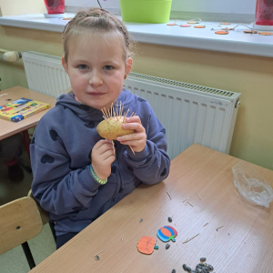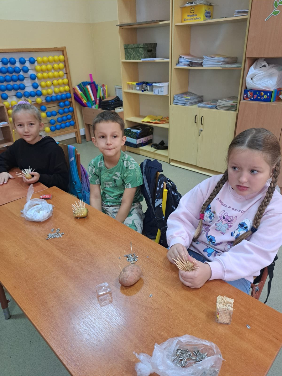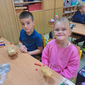 Dziś pierwszaki rozmawiały o tym, jak jesienią możemy dbać o zwierzęta. Zainspirowani tematyką przyrodniczą postanowiliśmy stworzyć własne jeżyki z ziemniaka, szaszłyka i ziaren słonecznika. Powstały przepiękne, pomysłowe prace – jeżyki niosące jabłuszka , które zachwyciły wszystkich! Brawo, pierwszaki!