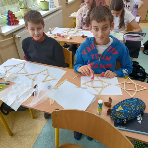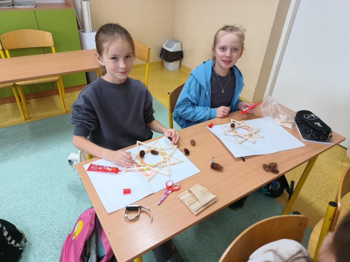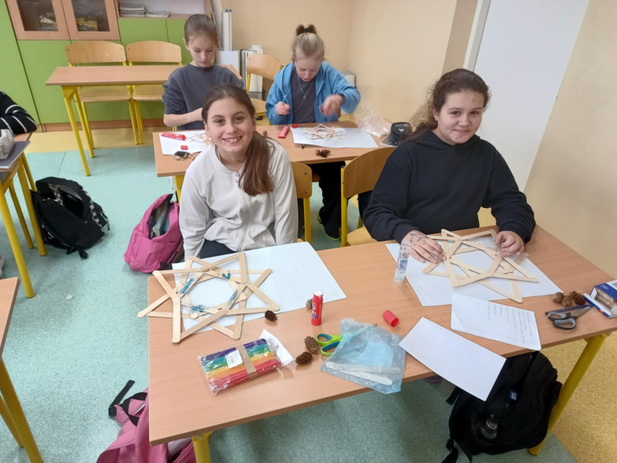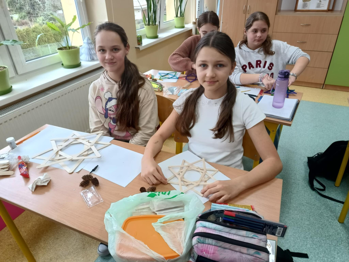 Podczas ostatniej lekcji techniki uczniowie klasy 5 z zaangażowaniem wykonywali gwiazdy z patyczków do lodów. Zadanie, choć proste pod względem materiałów, wymagało dokładności, cierpliwości oraz pracy zgodnie z podaną instrukcją.
