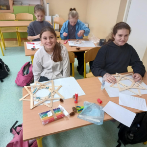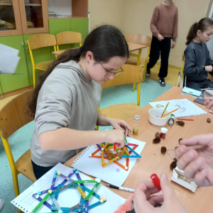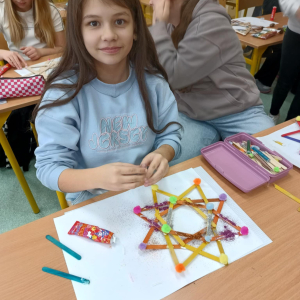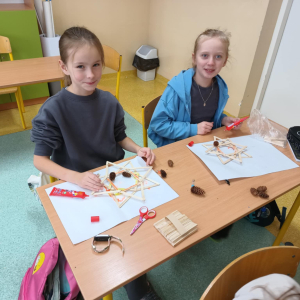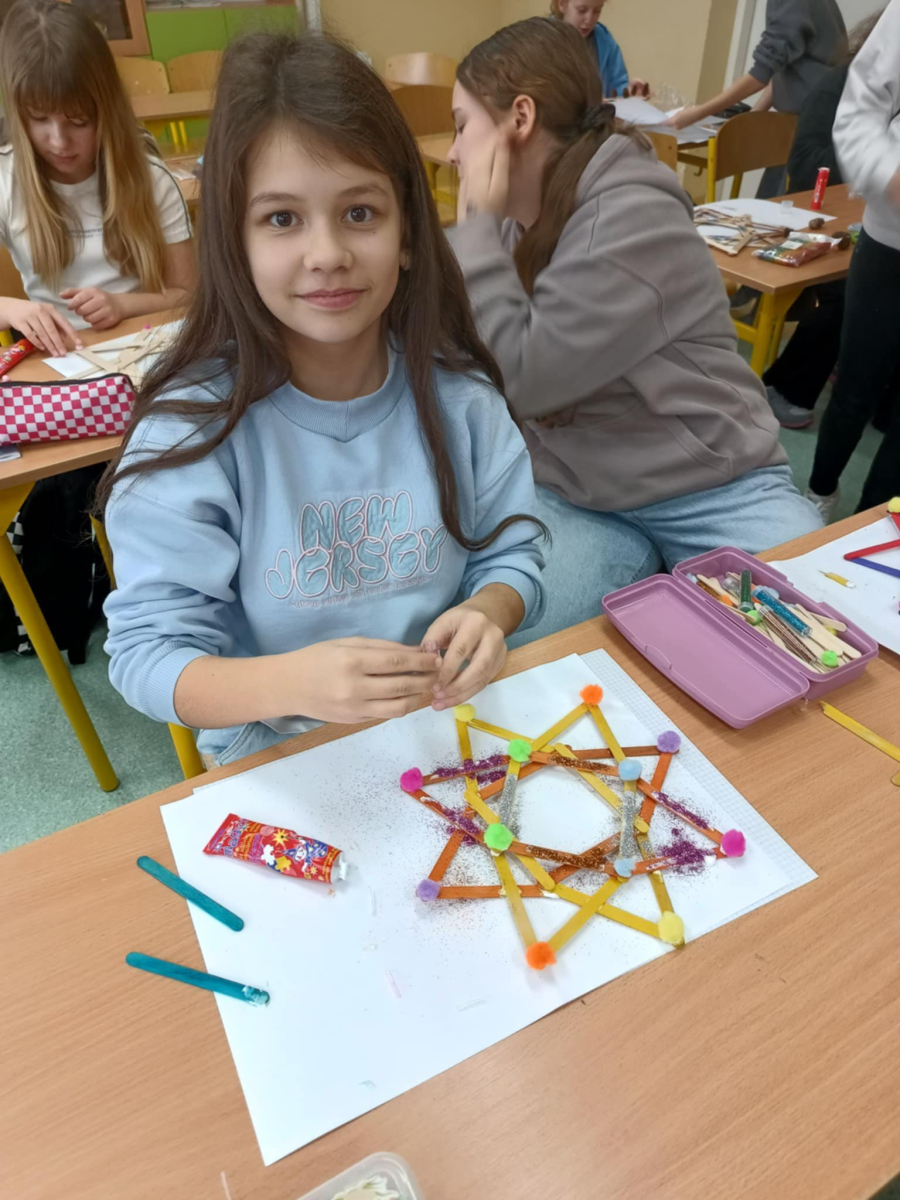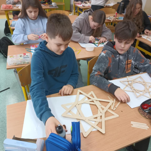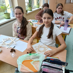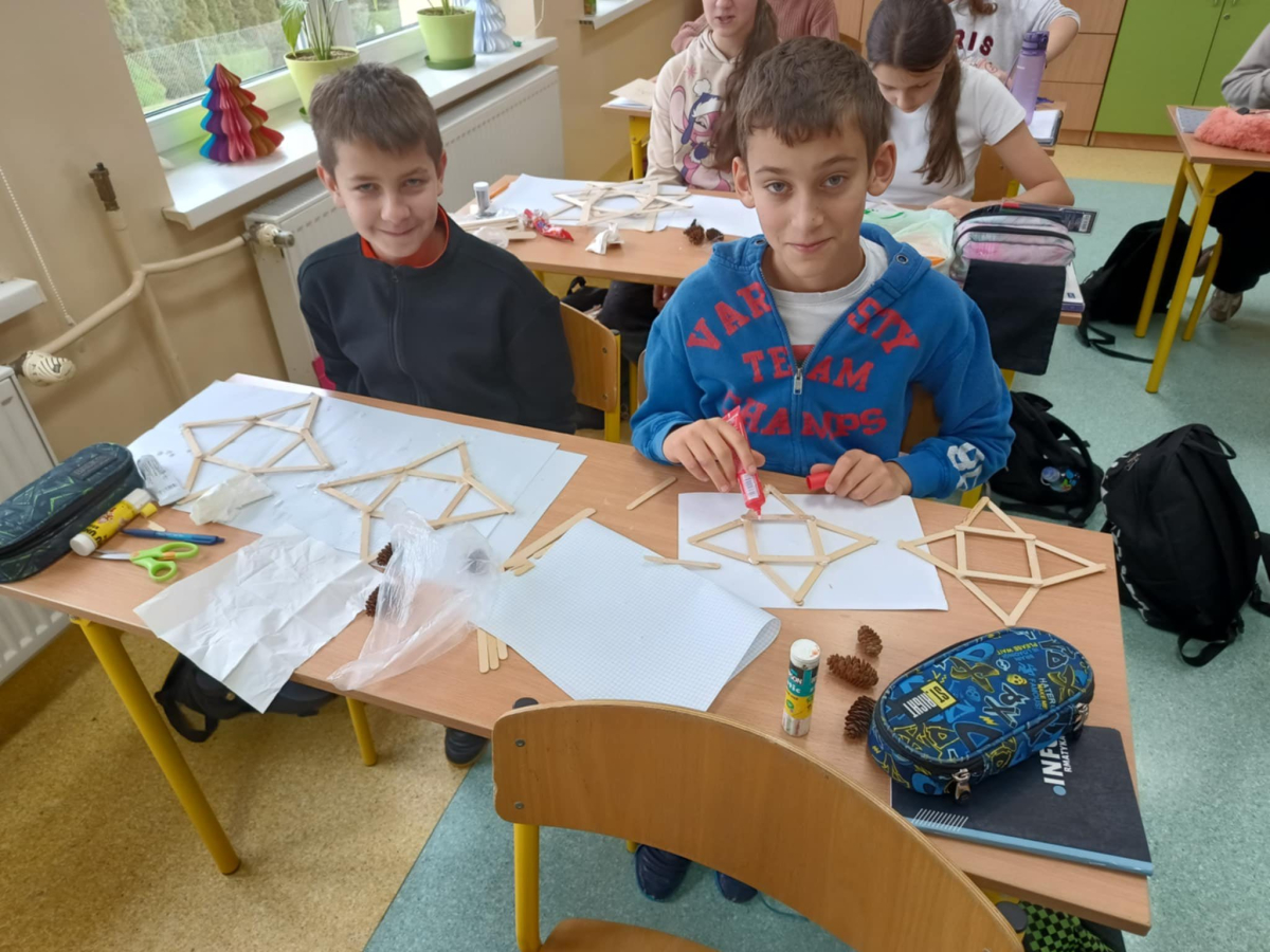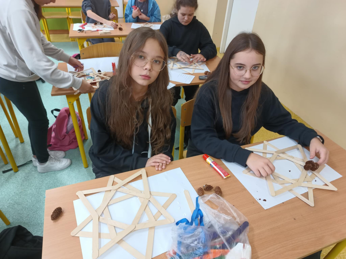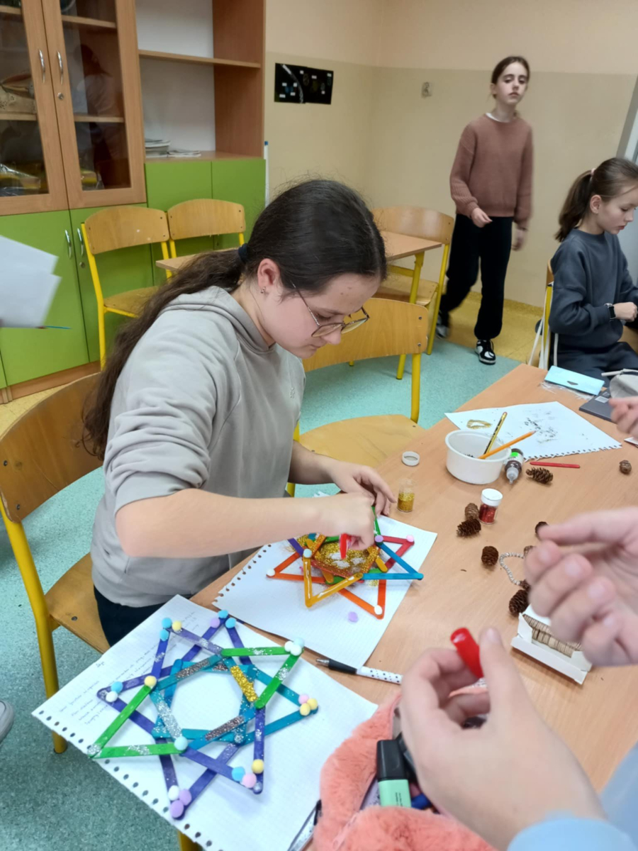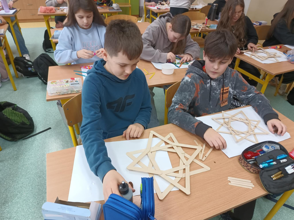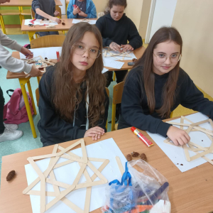 Piątoklasiści krok po kroku tworzyli swoje dekoracje, łącząc patyczki w różne układy i ozdabiając je według własnego pomysłu. Na zajęciach panowała twórcza atmosfera – uczniowie chętnie dzielili się pomysłami, pomagali sobie nawzajem i wykazywali dużą staranność wykonania.