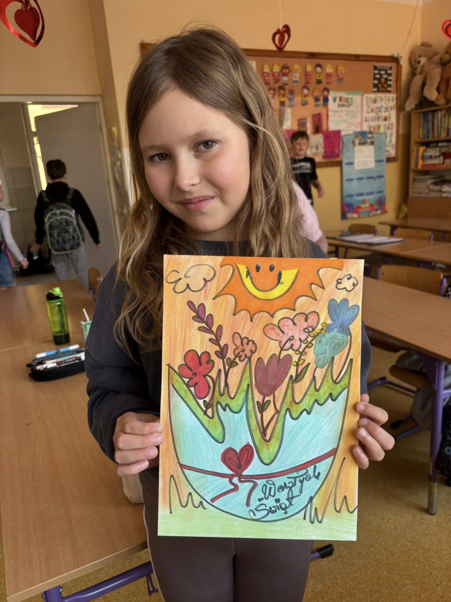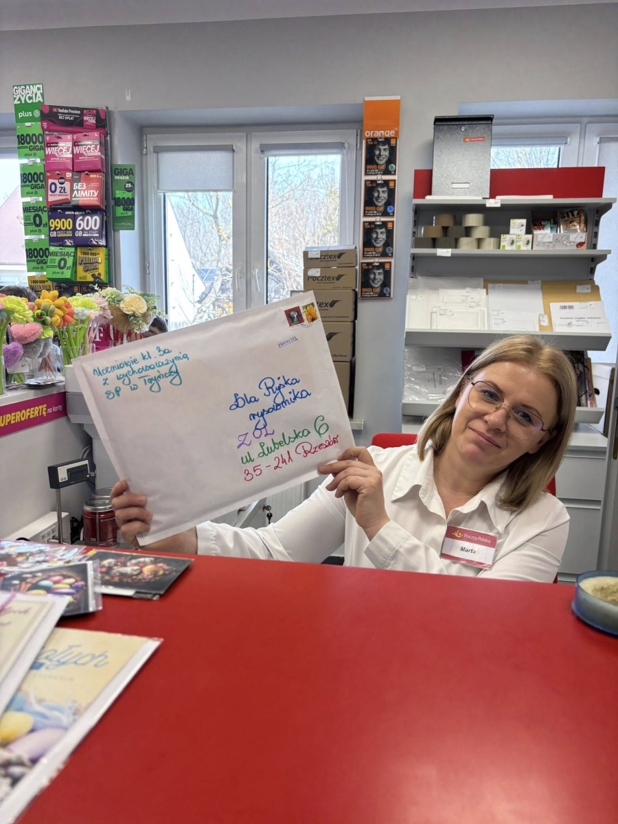 Z okazji Świąt Wielkanocnych uczniowie klasy 3a przygotowali dla niego kartki pełne najserdeczniejszych życzeń, dobrych myśli i uśmiechów zamkniętych w słowach. Dziś wspólnie poszliśmy na pocztę, by je nadać – z nadzieją, że gdy przesyłki dotrą na miejsce, przyniosą choć odrobinę radości i rozjaśnią ten dzień. Wierzymy, że nawet mały gest potrafi wiele zmienić, a pamięć i życzliwość mają ogromną siłę. Przesyłamy również serdeczne życzenia dla wszystkich osób, które są z Nim każdego dnia – dziękujemy za troskę, obecność i dobre serce.