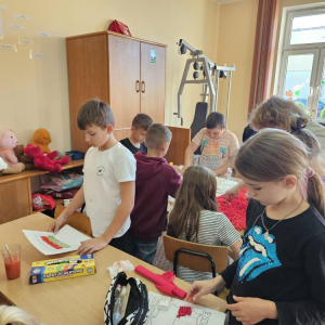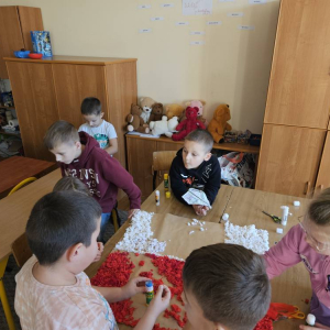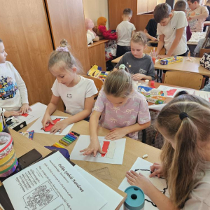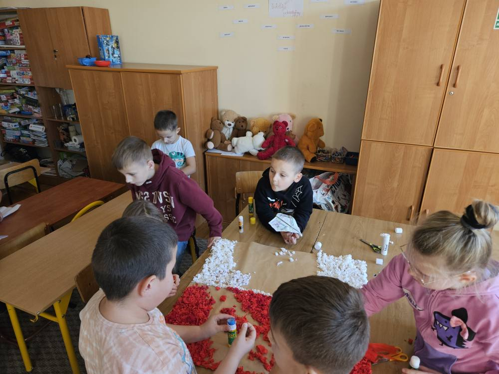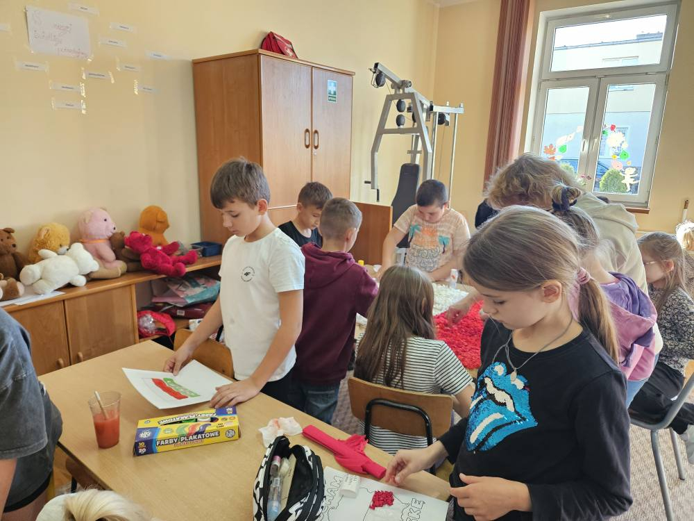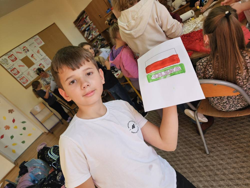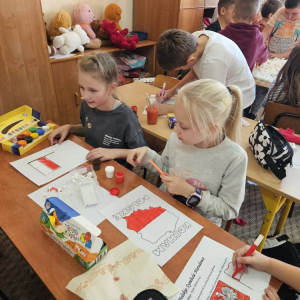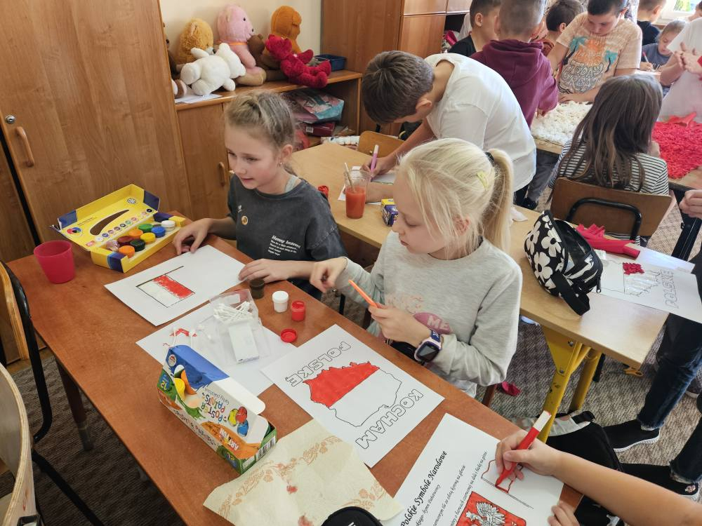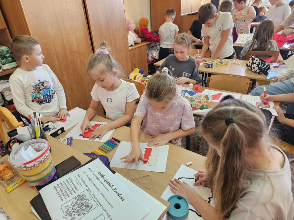Dzieci uczestniczące w zajęciach świetlicowych wypełniały karty pracy przybliżające symbole narodowe oraz podejmowały różne zadania plastyczne. Kolorowanki wyklejały plasteliną, bibułą i malowały farbami. Prace te znalazły się na gazetce ściennej. Zapewne ułatwi to zapamiętanie naszych symboli narodowych.