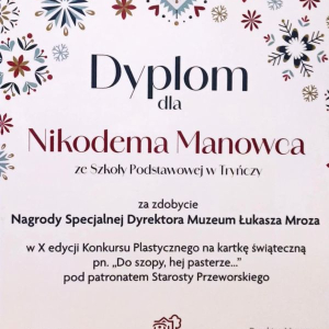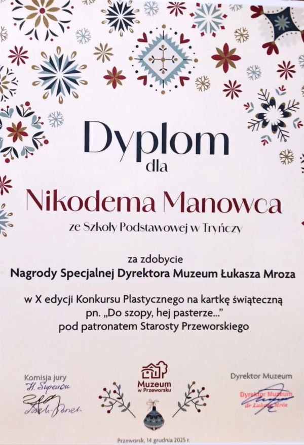 Wydarzenie objęte honorowym patronatem Starosty Przeworskiego zgromadziło młodych artystów z całego powiatu. Na konkurs wpłynęło 312 prac wykonanych przez dzieci w wieku od 4 - 12 lat w dwóch kategoriach wiekowych 4-7 lat oraz 8-12 lat. Z radością informujemy, że uczeń naszej szkoły Nikodem Manowiec otrzymał Nagrodę Specjalną Dyrektora Muzeum Łukasza Mroza.