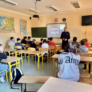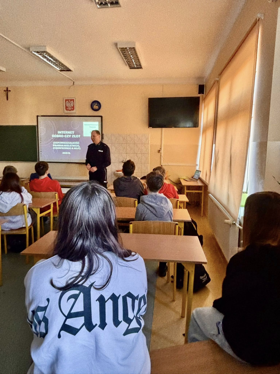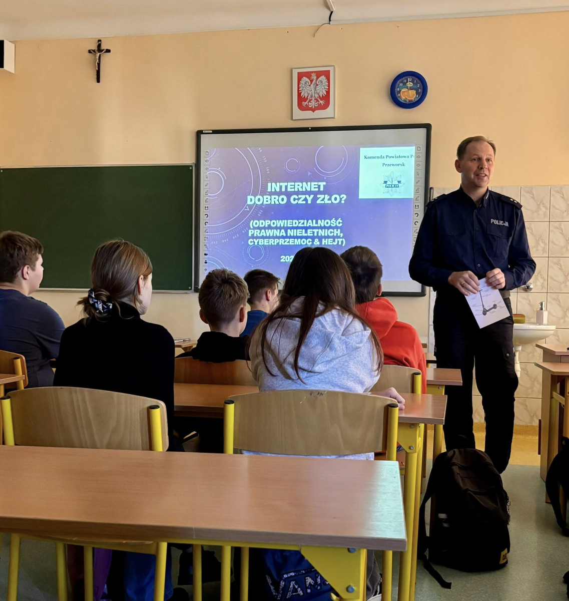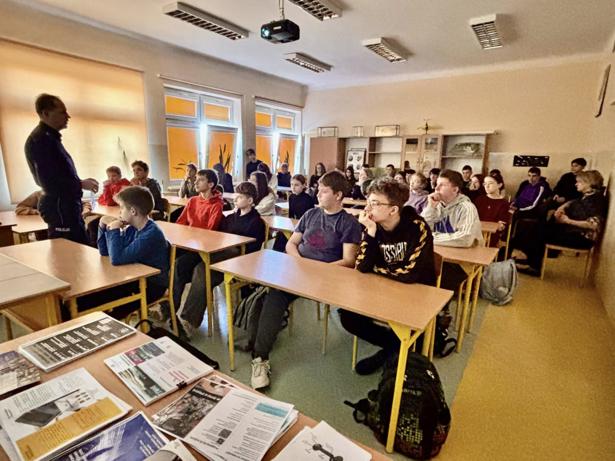 5 listopada uczniowie klas 7 i 8 uczestniczyli w bardzo ciekawym i pouczającym spotkaniu z podkomisarzem Mariuszem Czyrnym z Komendy Powiatowej Policji w Przeworsku. Podczas prelekcji poruszone zostały ważne i aktualne tematy dotyczące bezpieczeństwa młodzieży, m.in.:
