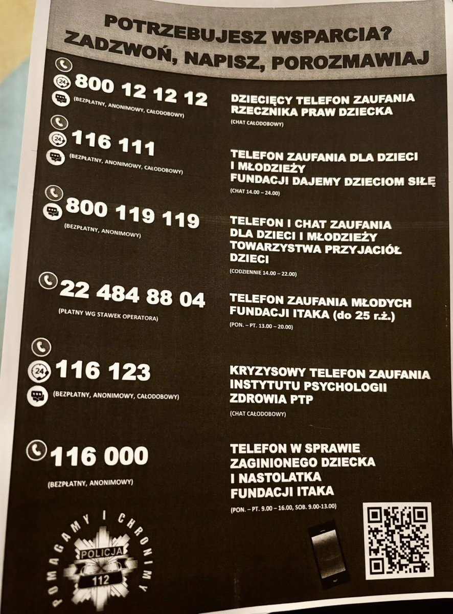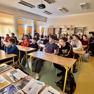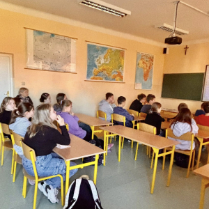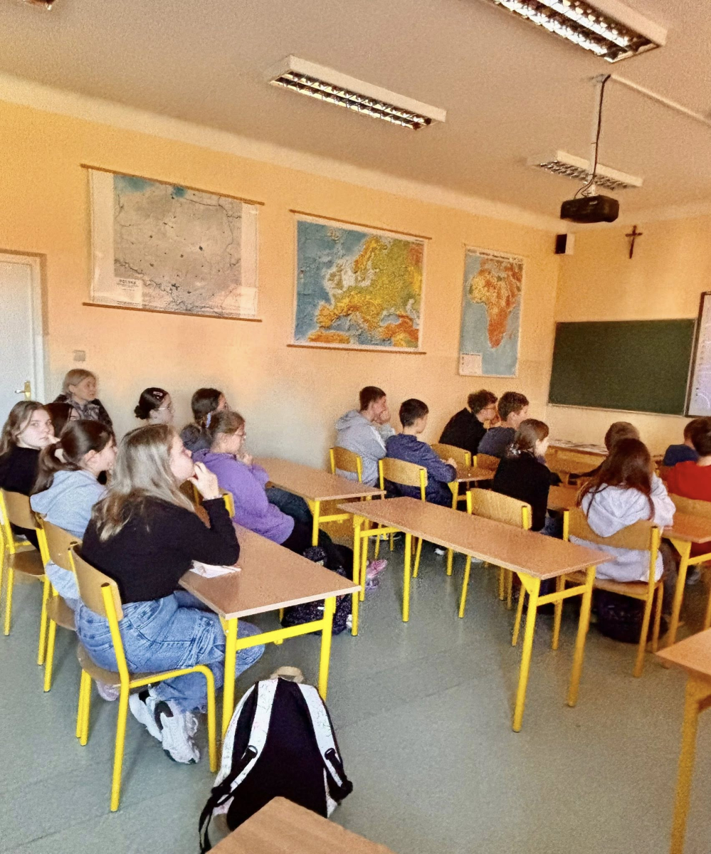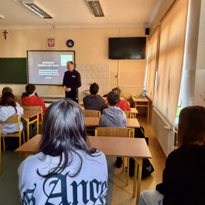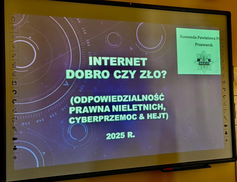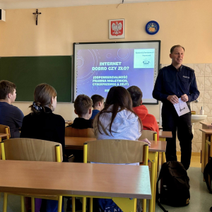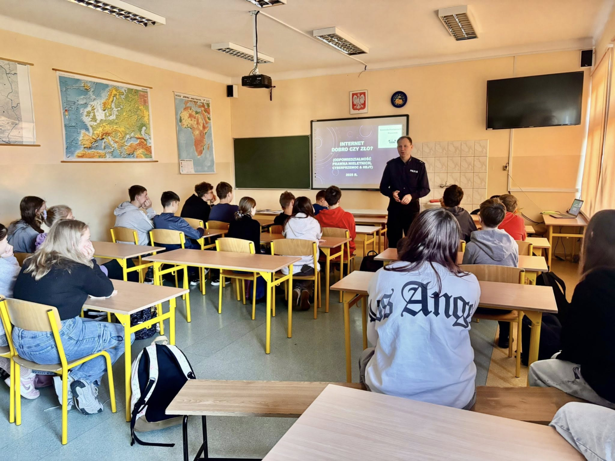 5 listopada uczniowie klas 7 i 8 uczestniczyli w bardzo ciekawym i pouczającym spotkaniu z podkomisarzem Mariuszem Czyrnym z Komendy Powiatowej Policji w Przeworsku. Podczas prelekcji poruszone zostały ważne i aktualne tematy dotyczące bezpieczeństwa młodzieży, m.in.: