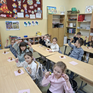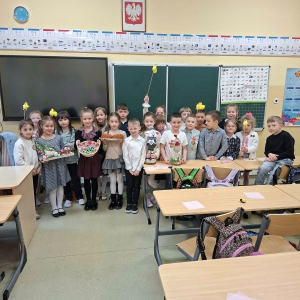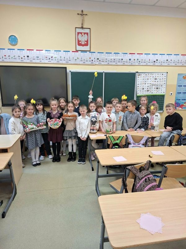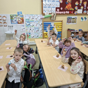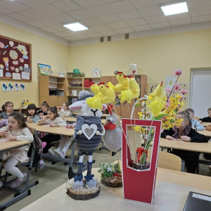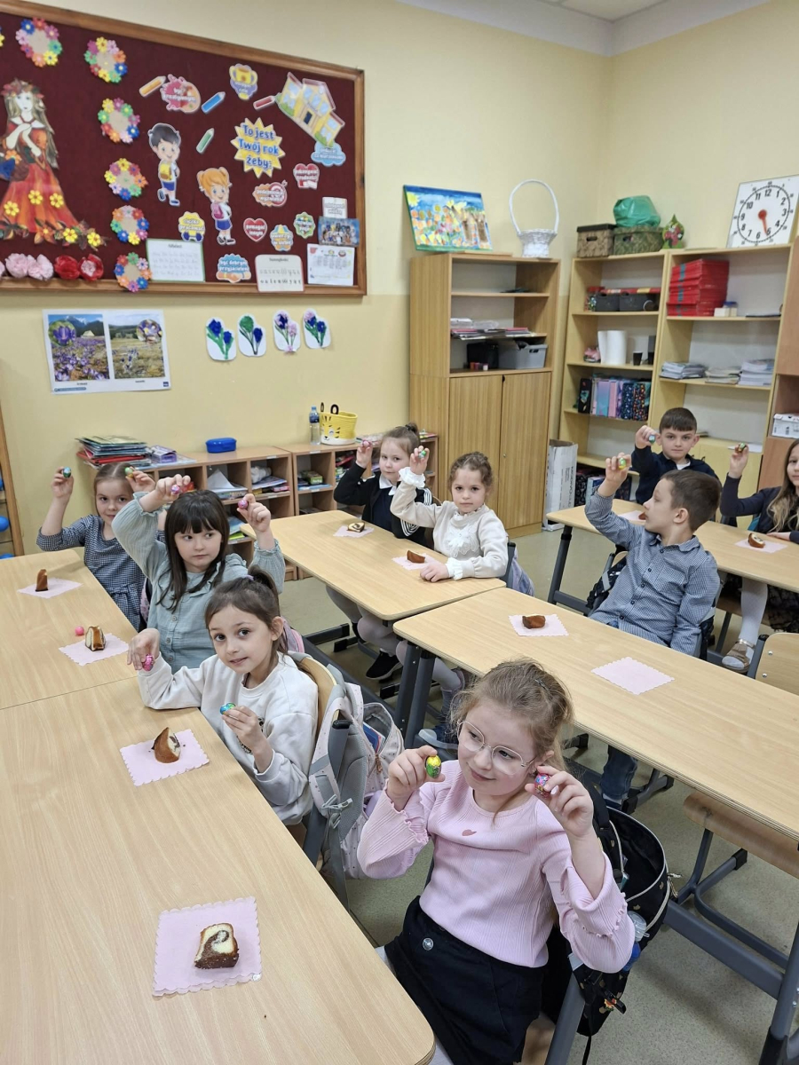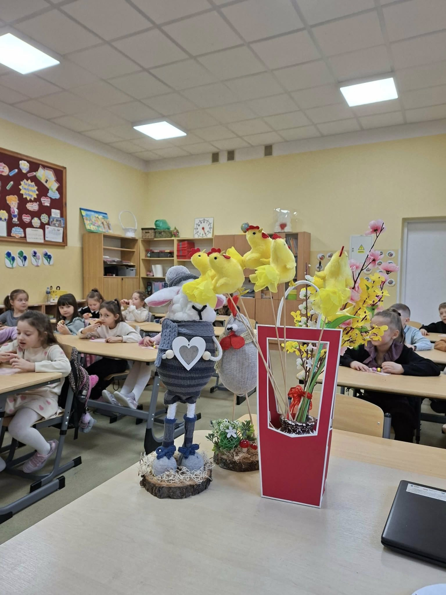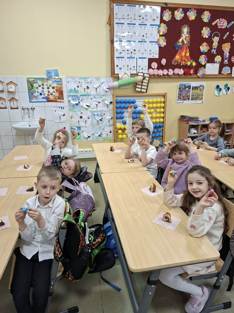 Świąteczna atmosfera w klasie pierwszej. Dziś uczniowie klasy pierwszej nie zapomnieli o pięknych zwyczajach i tradycjach wielkanocnych. Dzieci przyniosły do klasy różnorodne ozdoby wielkanocne, dzięki którym w naszej sali zapanowała prawdziwie świąteczna atmosfera. Wspólnie rozmawialiśmy o tradycjach i zwyczajach związanych z Wielkanocą oraz o symbolach znajdujących się w koszyczku wielkanocnym. Na zakończenie spotkania uczniowie poczęstowali się pyszną babą wielkanocną oraz otrzymali małe pisanki – jedne z najważniejszych symboli świąt, o których wcześniej rozmawialiśmy. Nie zabrakło również pięknych stroików wielkanocnych, które dzieci z dumą prezentowały. To był bardzo miły, świąteczny czas spędzony na wspólnym poznawaniu i pielęgnowaniu naszych tradycji.