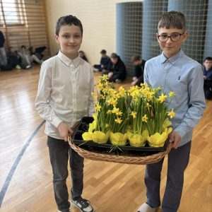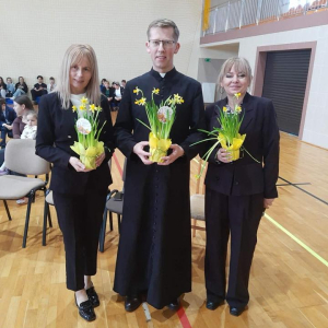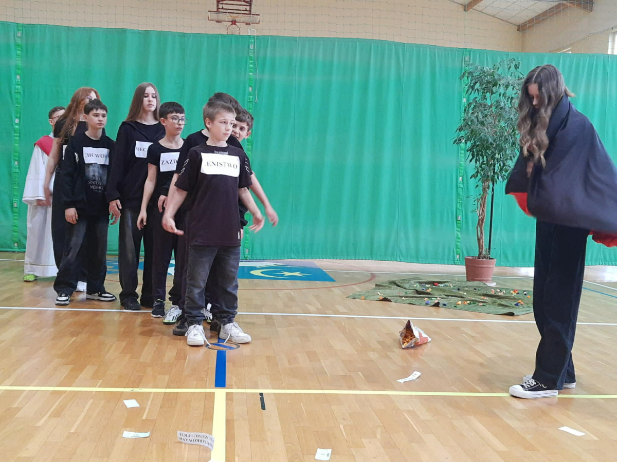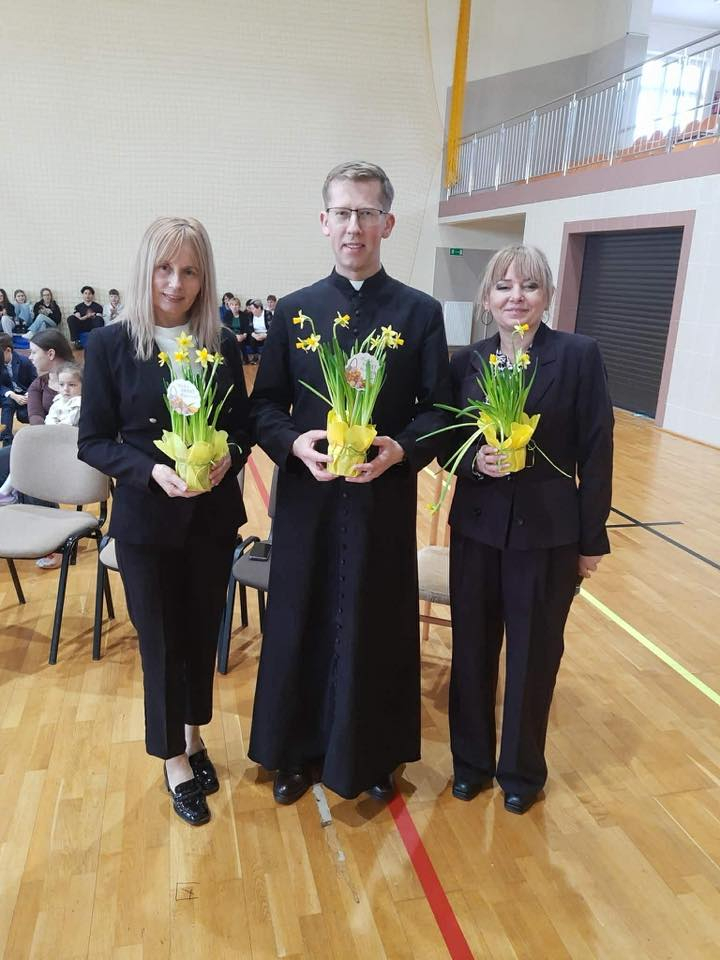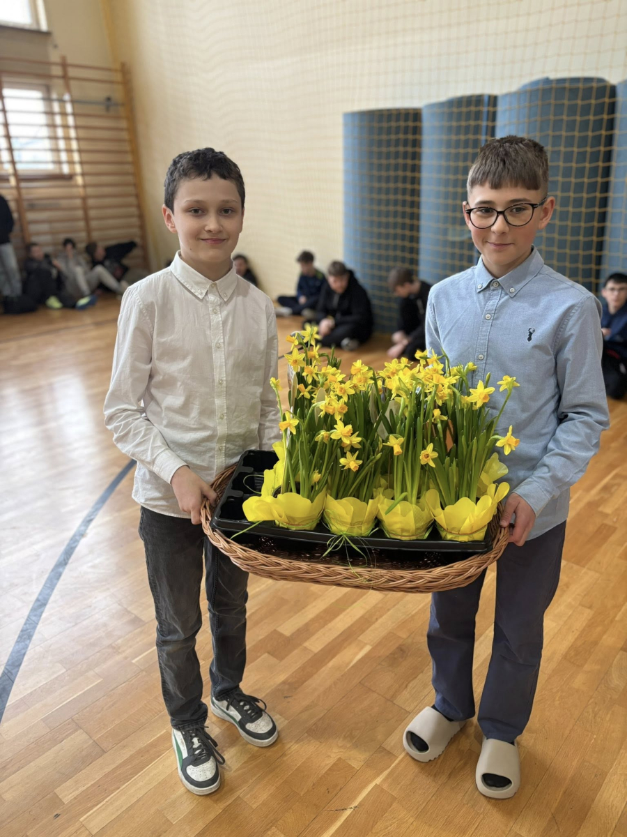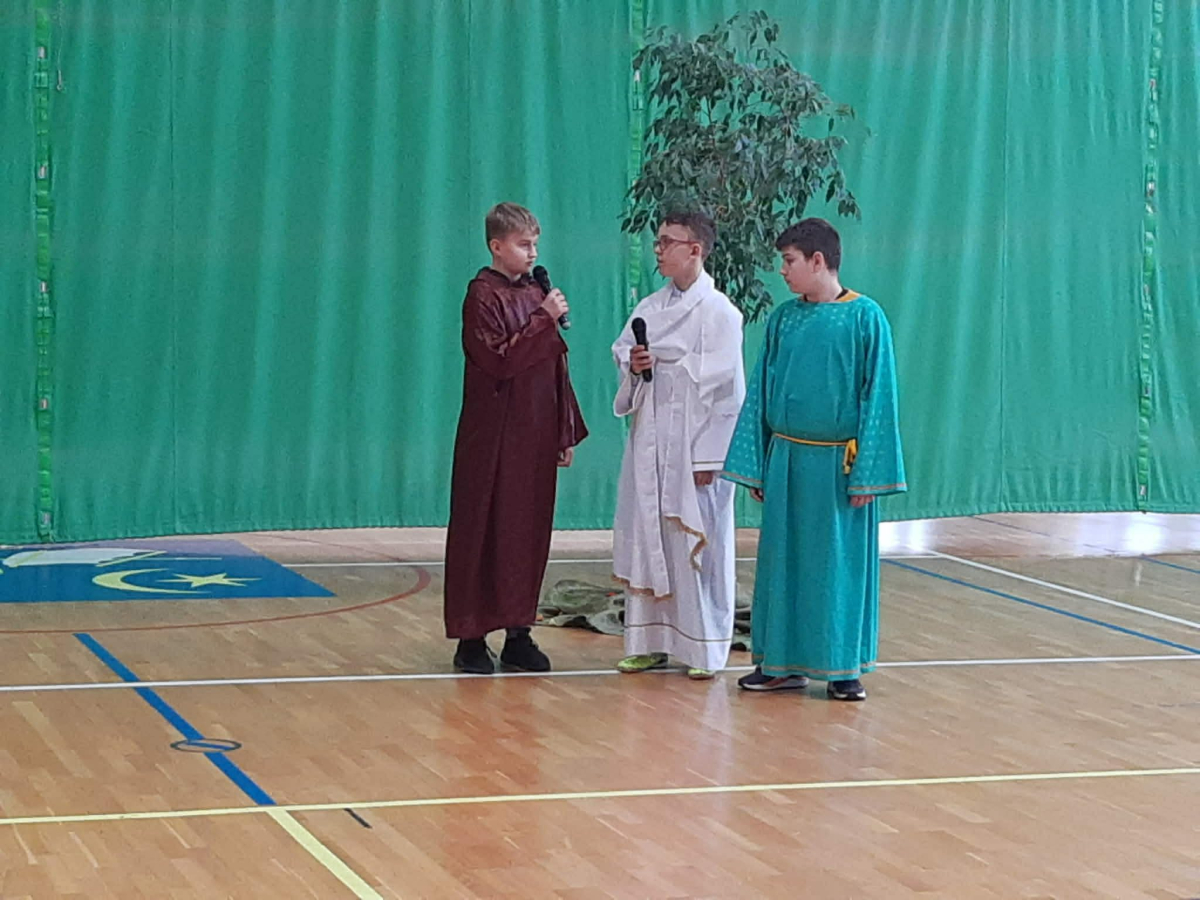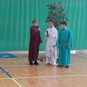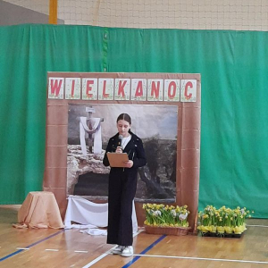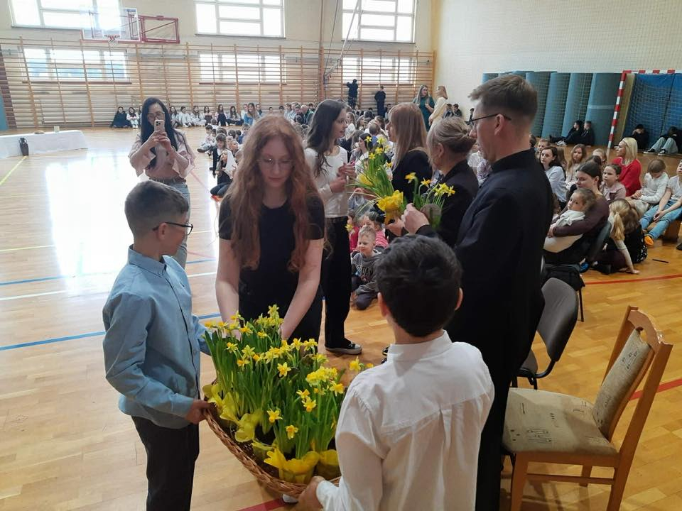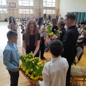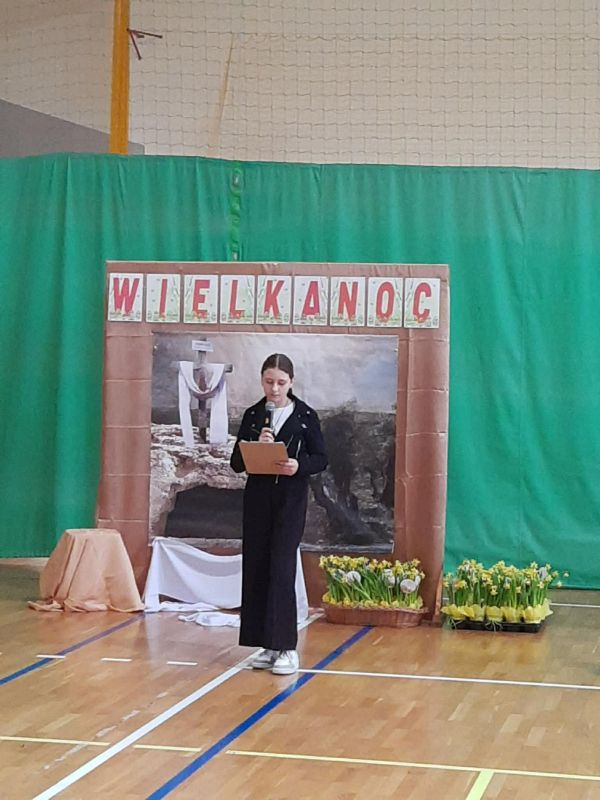 Dziś spotkaliśmy się na uroczystym apelu z okazji zbliżających się Świąt Wielkanocnych. Obejrzeliśmy pantomimę oraz scenkę z Jonatanem i uczniami idącymi do Emaus, w wykonaniu uczniów klasy 6, przygotowanych przez siostrę Annę Macinę i panią Ewę Daniszewską. Na zakończenie spotkania, całej społeczności szkolnej, życzenia świąteczne złożyła pani dyrektor Elżbieta Kubrak