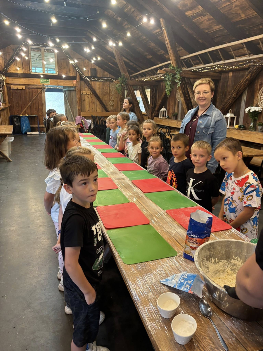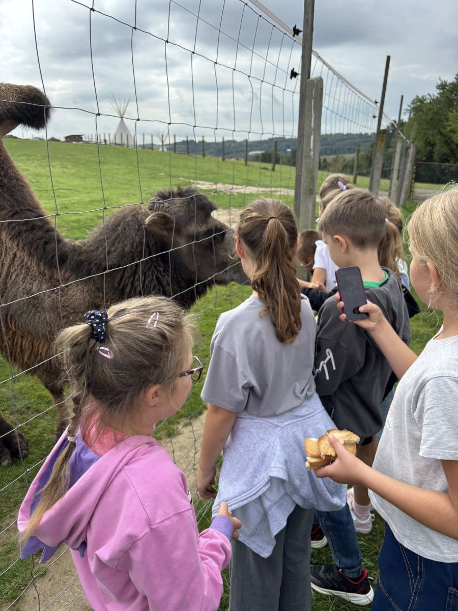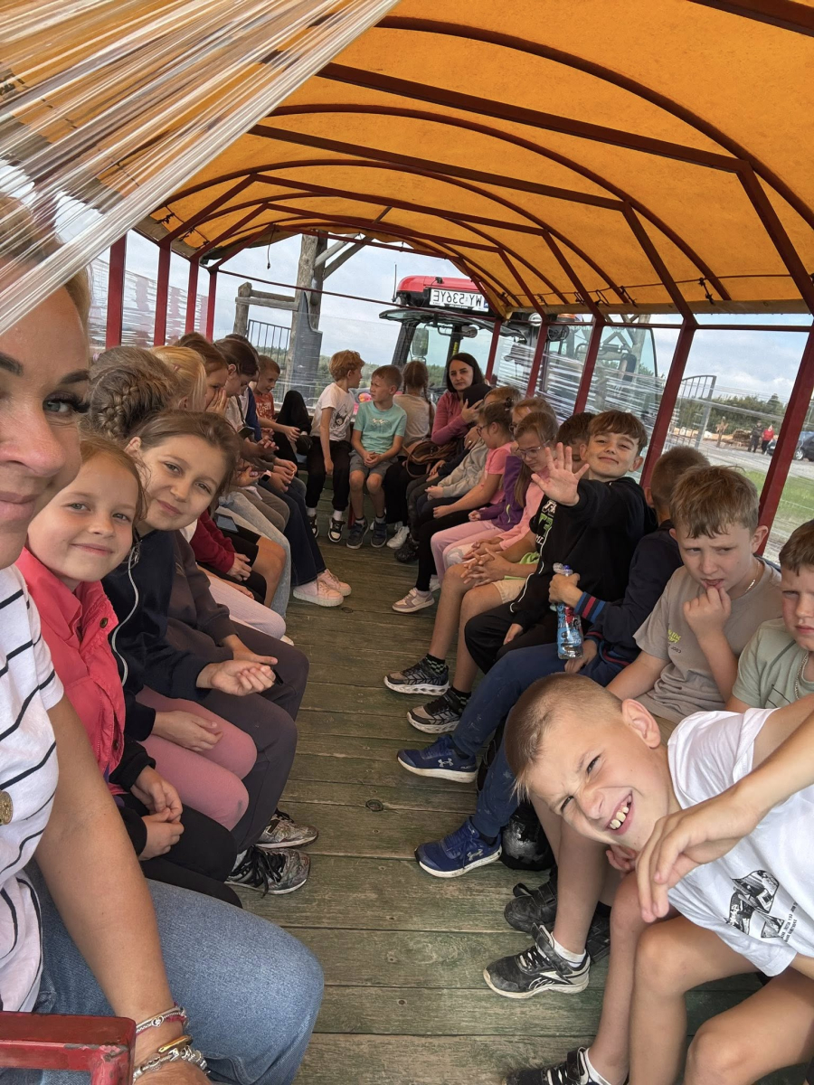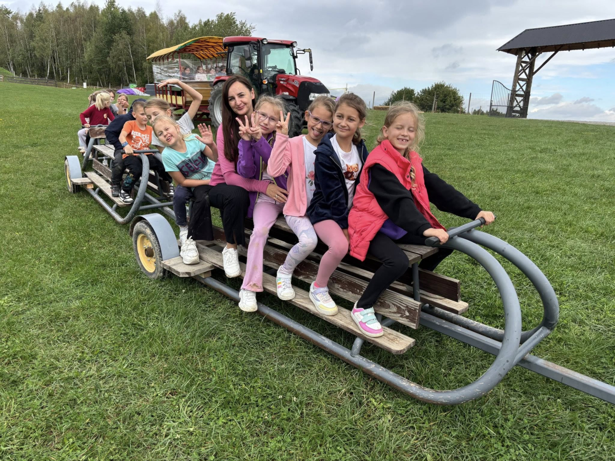Już od rana czekało na nich mnóstwo atrakcji! Najpierw odwiedzili Mini ZOO w stylu safari, gdzie mogli karmić i głaskać zwierzęta . Później zajrzeli do indiańskiego Tipi i wspięli się na wieżę widokową, skąd podziwiali piękne okolice. Ogromną frajdę sprawił dzieciom letni kulig na saniach z kołami , a także zabawa w parku linowym „Małpi Gaj”, na torze pontonowym, byku rodeo i dmuchańcach. W trakcie pobytu uczniowie wzięli udział w warsztatach pieczenia proziaków , a na obiad czekała na nich pyszna kiełbaska z grilla. Do tego przez cały czas dostępne były ciasteczka, herbata i woda. To był dzień pełen śmiechu, zabawy i nowych doświadczeń!