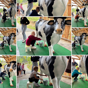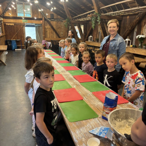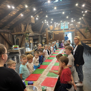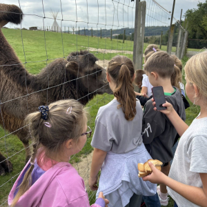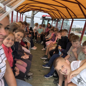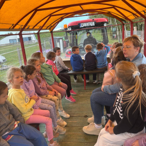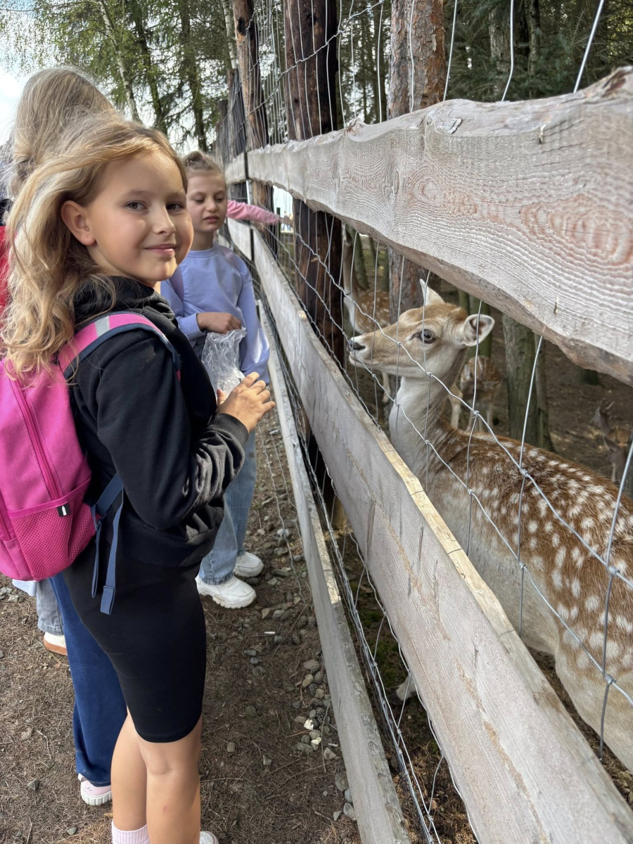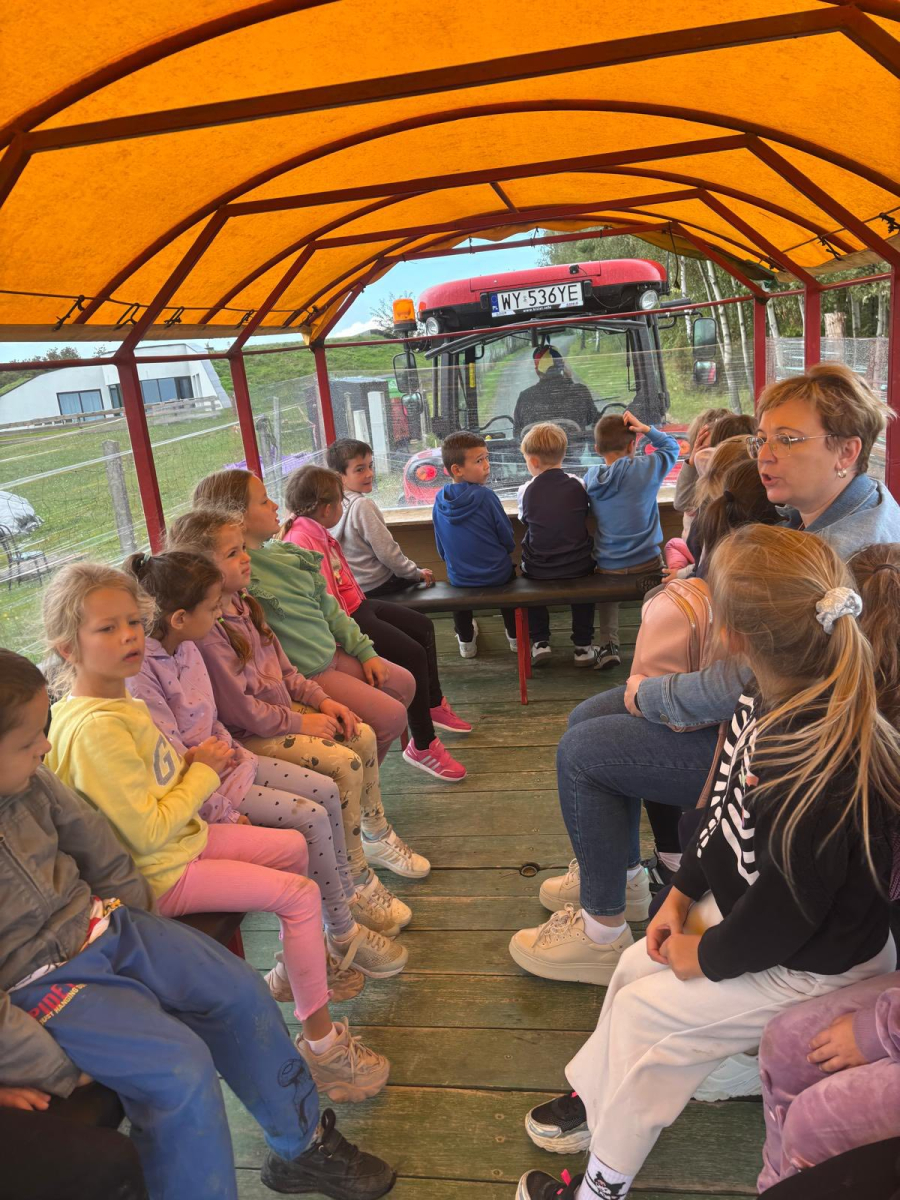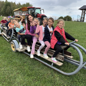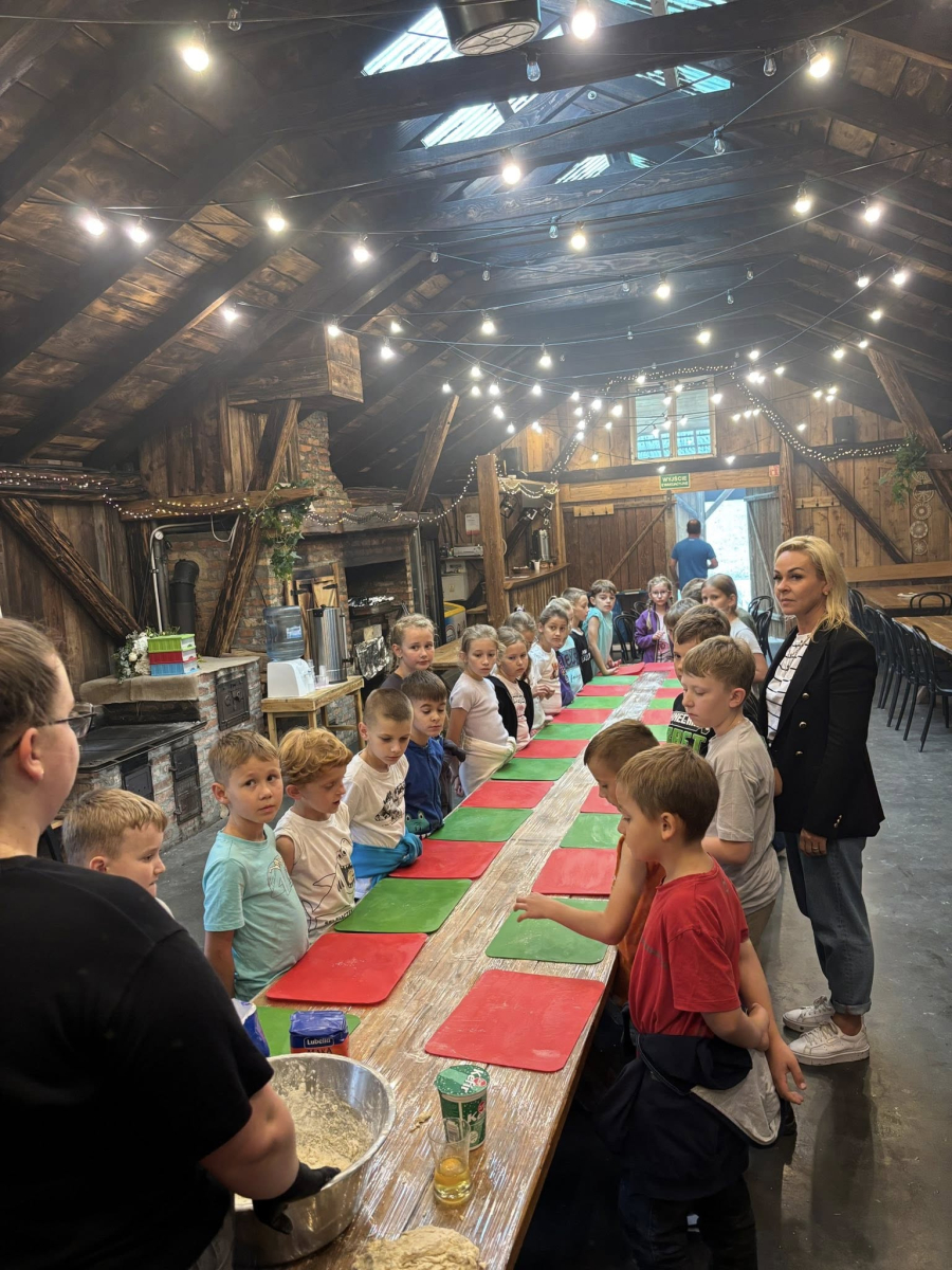 Już od rana czekało na nich mnóstwo atrakcji! Najpierw odwiedzili Mini ZOO w stylu safari, gdzie mogli karmić i głaskać zwierzęta . Później zajrzeli do indiańskiego Tipi i wspięli się na wieżę widokową, skąd podziwiali piękne okolice. Ogromną frajdę sprawił dzieciom letni kulig na saniach z kołami , a także zabawa w parku linowym „Małpi Gaj”, na torze pontonowym, byku rodeo i dmuchańcach. W trakcie pobytu uczniowie wzięli udział w warsztatach pieczenia proziaków , a na obiad czekała na nich pyszna kiełbaska z grilla. Do tego przez cały czas dostępne były ciasteczka, herbata i woda. To był dzień pełen śmiechu, zabawy i nowych doświadczeń!