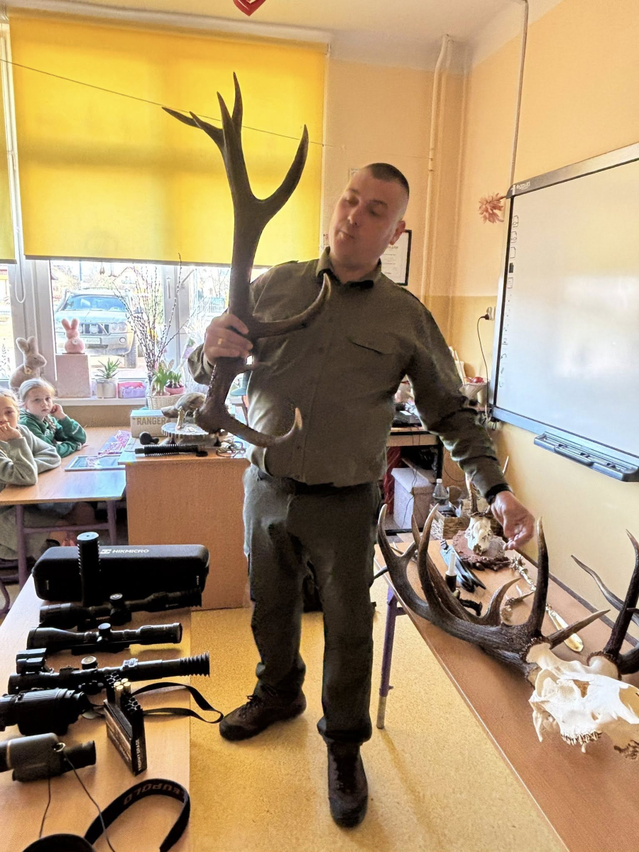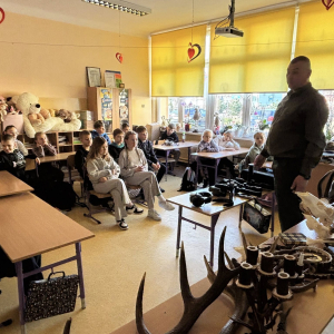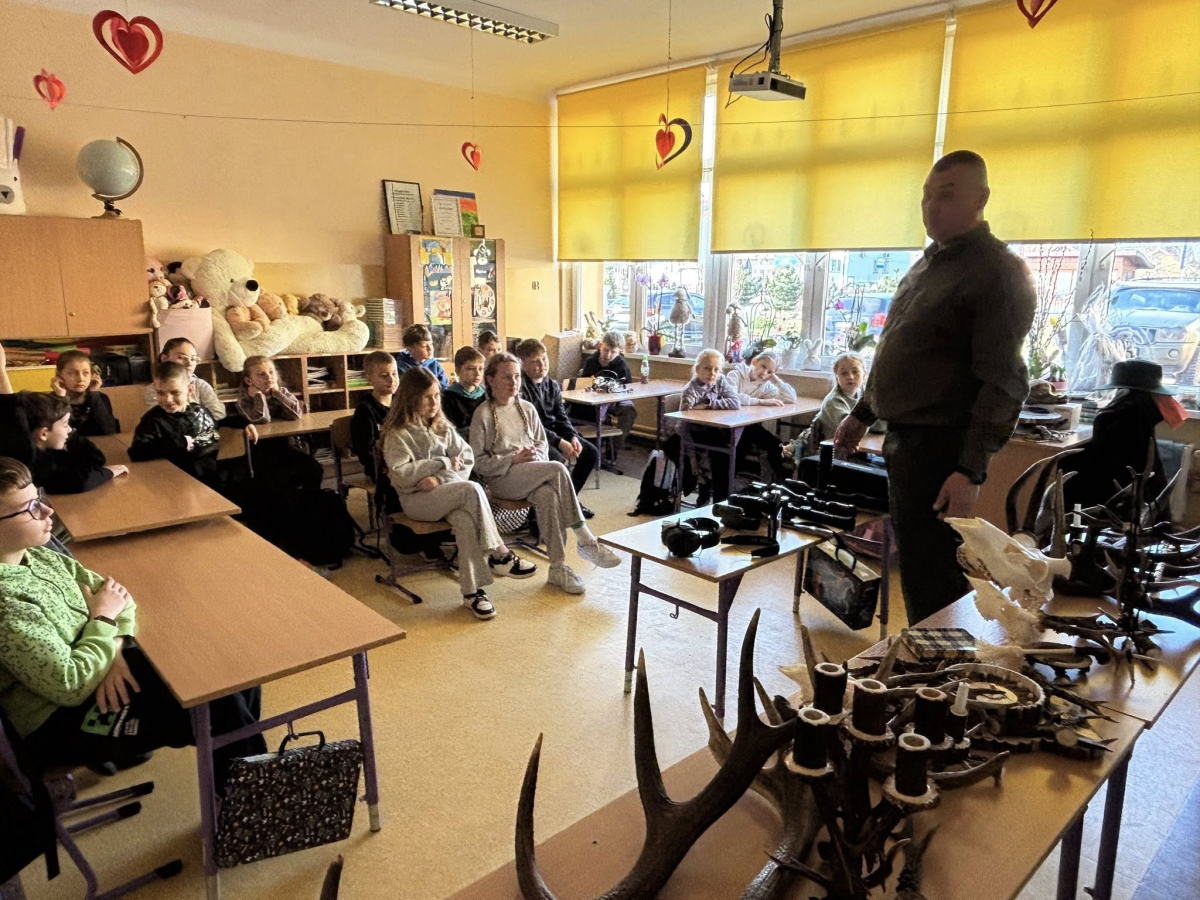 Pan Kamil opowiadał dzieciom o życiu dzikich zwierząt oraz o tym, jak wygląda przyroda w lesie o różnych porach roku. Uczniowie mogli zobaczyć z bliska różne eksponaty związane z przyrodą – między innymi poroża jeleni oraz inne ciekawe elementy pochodzące z lasu.