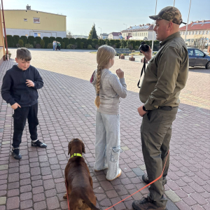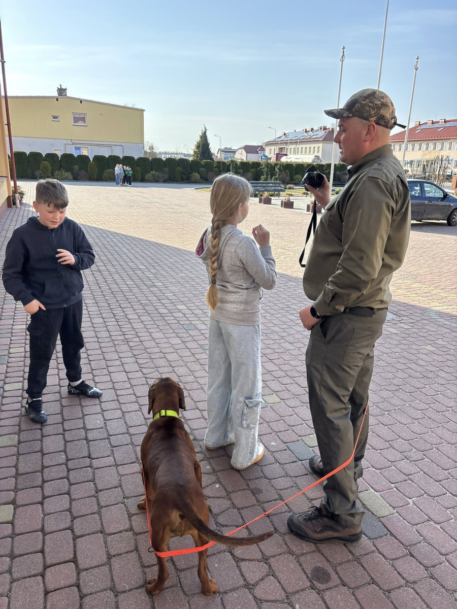 Podczas spotkania dzieci miały również okazję poznać psa, który towarzyszył naszemu gościowi. Było to dla uczniów bardzo miłe i ciekawe doświadczenie